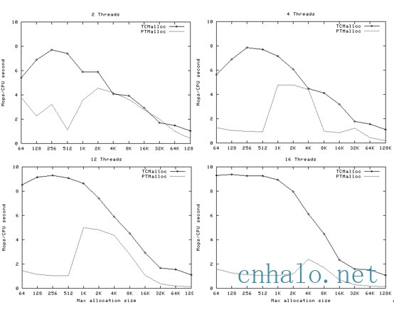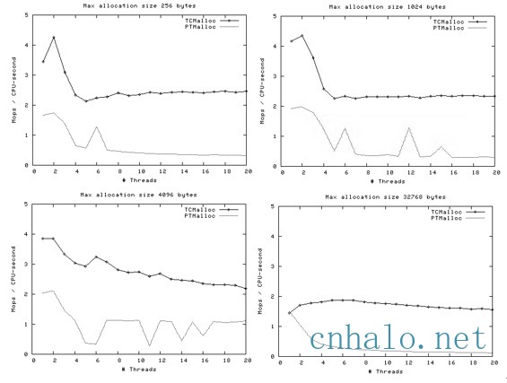 上图中可以看到尤其是对于小内存的分配, tcmalloc有非常明显性能优势。