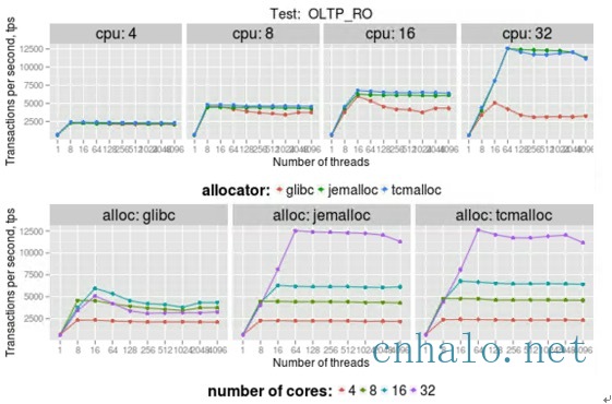 可以看到在多核心或者多线程的场景下, jemalloc和tcmalloc带来的tps增加非常明显。