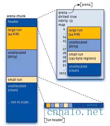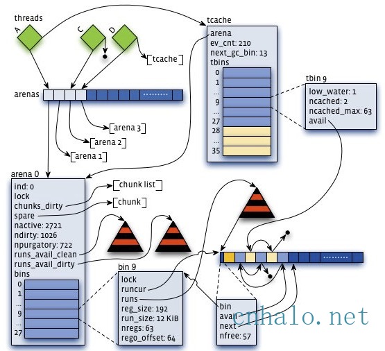 - 虚拟内存被逻辑上分割成chunks(默认是4MB,1024个4k页),应用线程通过round-robin算法在第一次malloc的时候分配arena, 每个arena都是相互独立的,维护自己的chunks, chunk切割pages到small/large对象。free()的内存总是返回到所属的arena中,而不管是哪个线程调用free()。