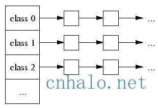 小对象有将近170个不同的大小分类(class),每个class有个该大小内存块的FreeList单链表,分配的时候先找到best fit的class,然后无锁的获取该链表首元素返回。如果链表中无空间了,则到CentralCache中划分几个页面并切割成该class的大小,放入链表中。