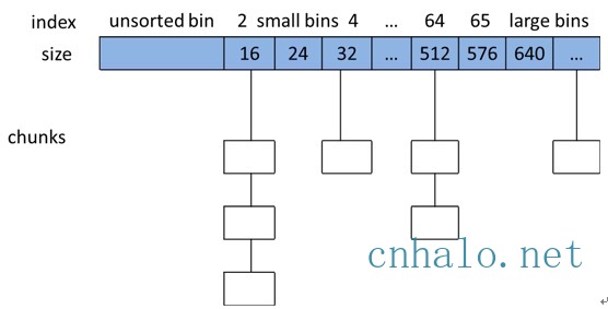 bins 内的 chunk 合并后进入 unsorted binsSmall bins:数组中从 2 开始编号的前 64 个 bin 称为 small bins, 等大 chunk,每种 size 一个 bin,