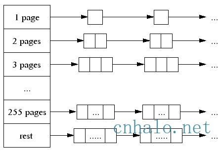 - 大对象(>32K)先4k对齐后,从CentralCache中分配。 CentralCache维护的PageHeap如下图所示, 数组中第256个元素是所有大于255个页面都挂到该链表中。