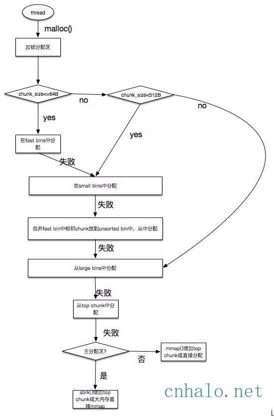 - Ptmalloc2有一个主分配区(main arena), 有多个非主分配区。 非主分配区只能使用mmap向操作系统批发申请HEAP_MAX_SIZE(64位系统为64MB)大小的虚拟内存。 当某个线程调用malloc的时候,会先查看线程私有变量中是否已经存在一个分配区,如果存在则尝试加锁,如果加锁失败则遍历arena链表试图获取一个没加锁的arena, 如果依然获取不到则创建一个新的非主分配区。